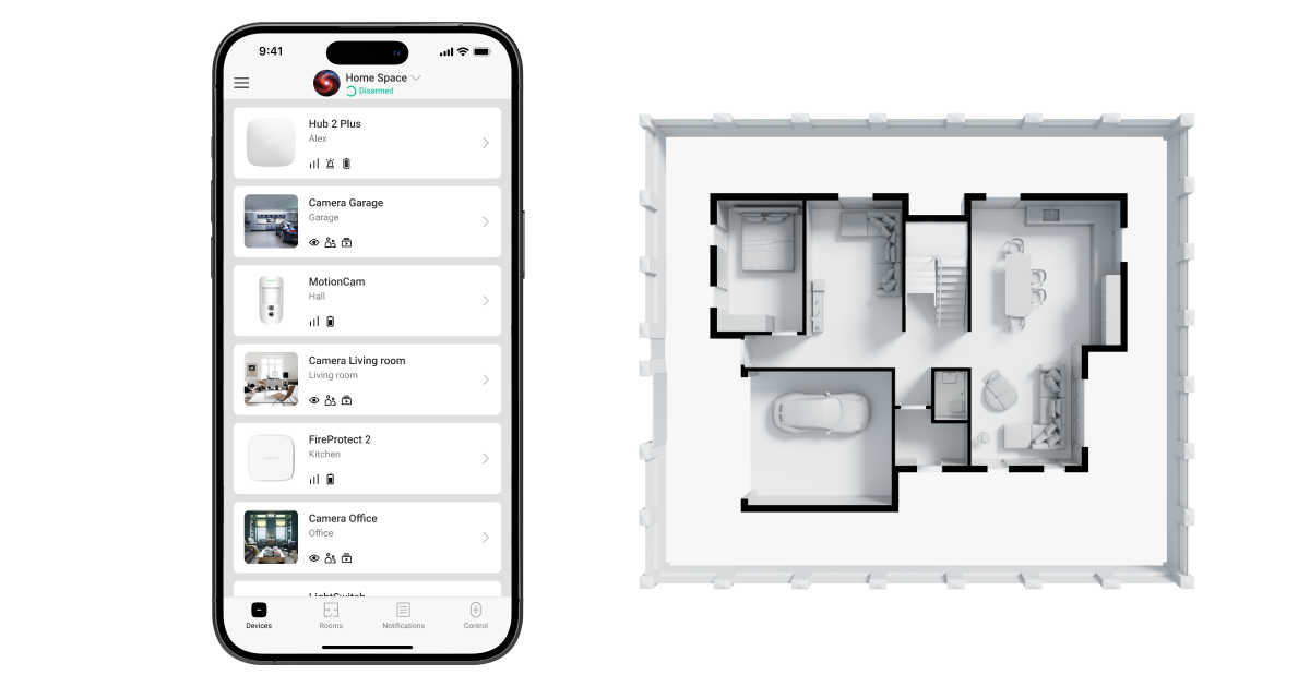 Trong ứng dụng Ajax, người dùng có thể dễ dàng cấu hình các thiết bị, bao gồm phòng, nhóm, loại thiết bị ("cảm biến"), và loại cảnh báo. Kết quả là, người dùng nhận được thông báo rõ ràng về thời điểm và địa điểm xảy ra cảnh báo. Công ty an ninh nhận được mã cảnh báo chính xác, giúp họ dễ dàng phản ứng khi có cảnh báo.