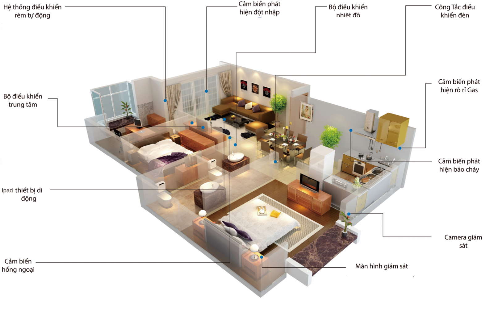 - Hệ thống điều khiển chiếu sáng: được kết hợp với cảm biến, thời gian để thực hiện tự động hóa, ngoài ra có thể điều khiển thông qua gương thông minh/ điện thoại/ giọng nói/ cử chỉ/ remote/ nút nhấn và tự động hóa